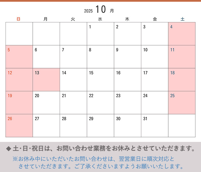 ■ 土・日・祝日は、メールやフォームのお問い合わせのお返事は、翌営業日となります。
