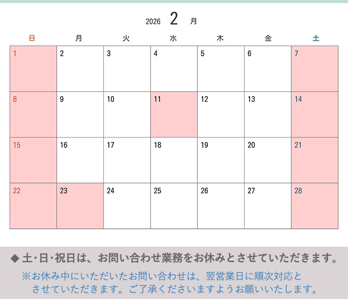 ■ 土・日・祝日は、メールやフォームのお問い合わせのお返事は、翌営業日となります。