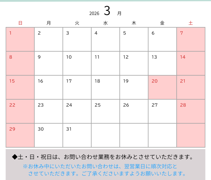 ■ 土・日・祝日は、メールやフォームのお問い合わせのお返事は、翌営業日となります。