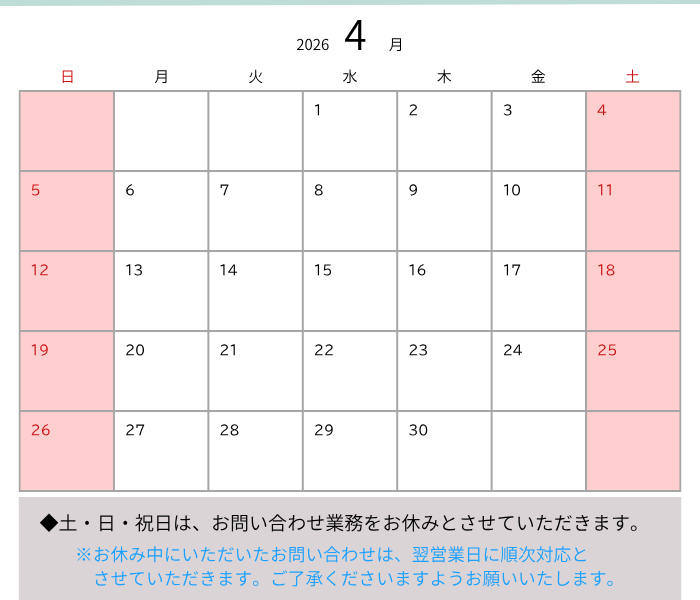 ■ 土・日・祝日は、メールやフォームのお問い合わせのお返事は、翌営業日となります。