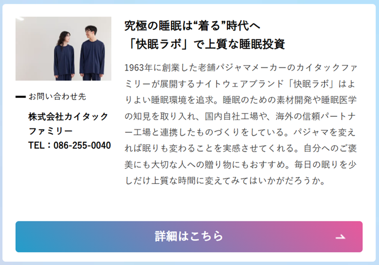 快眠ラボはよりよい睡眠環境をテーマに老舗パジャマメーカーから生まれたナイトウェアブランドです。国内の自社工場や海外の信頼パートナー工場と一緒にものづくりをしています。
