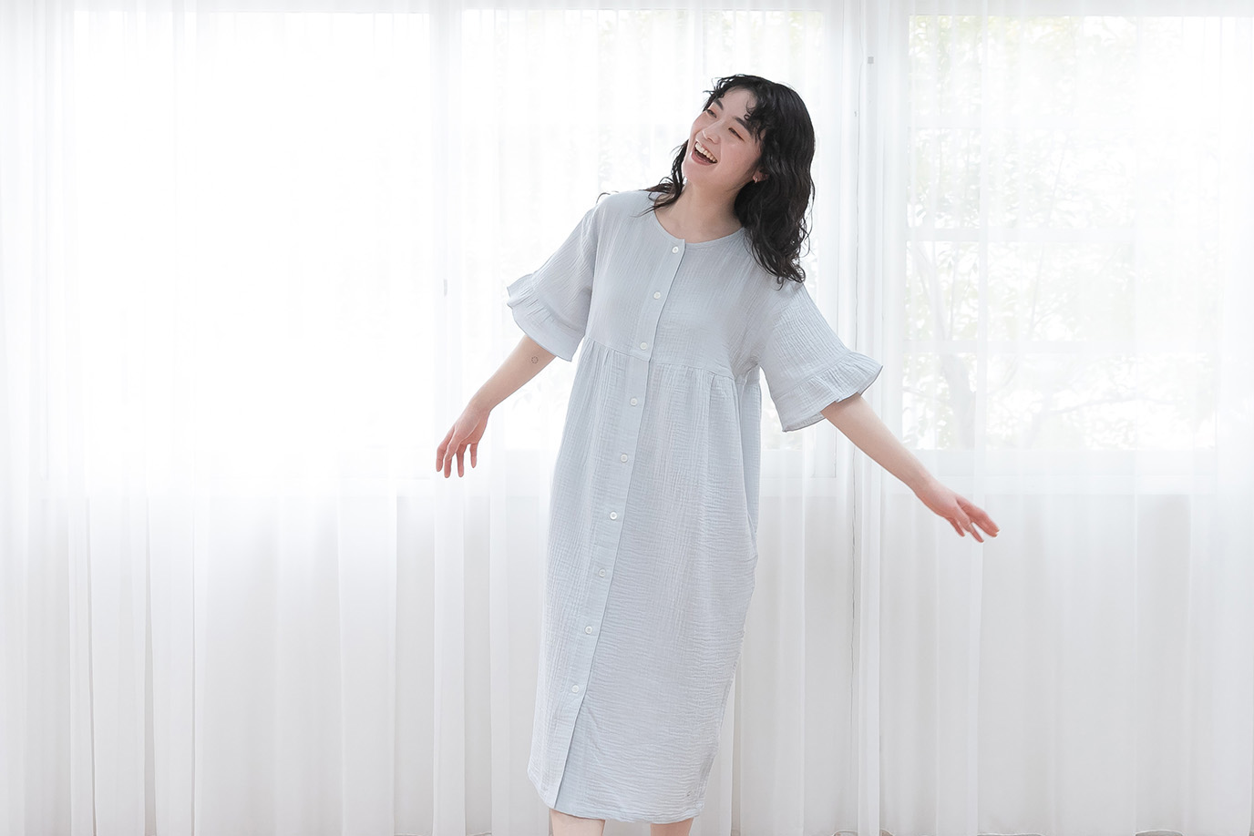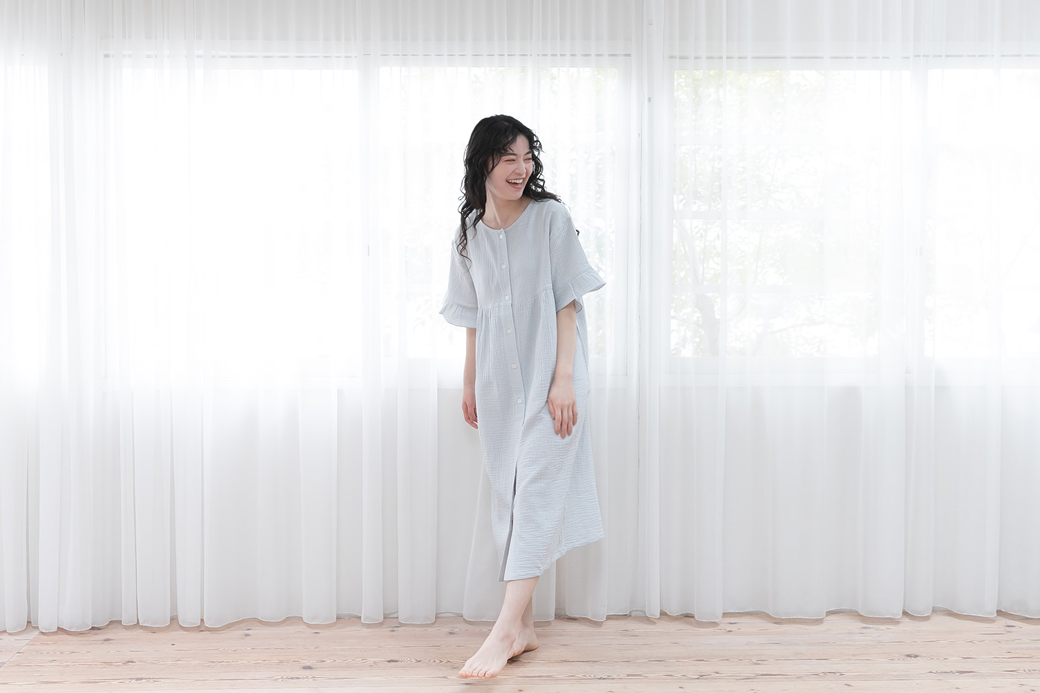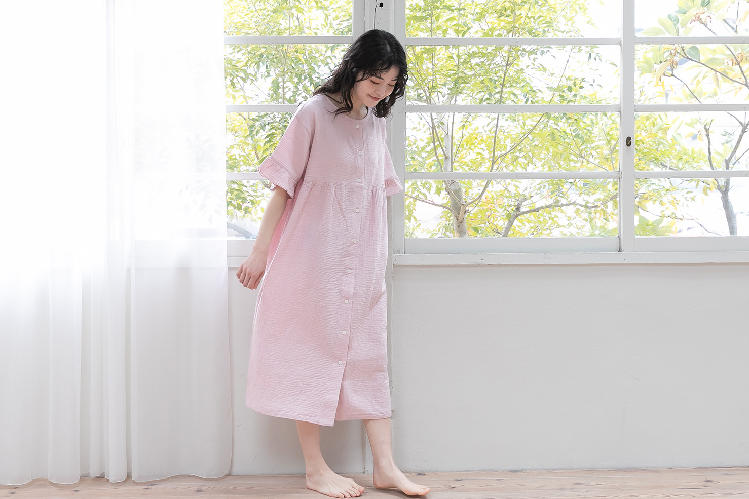 乾燥が気になる季節も、心地よく眠れるナイトウェア。 アフリカ原産の保湿成分「シアバター」をはじめ、オリーブオイル、シルクアミノ酸、スクワランなど、4つの天然由来スキンケア成分を配合した特別な加工を施したガーゼ素材を使用。 まるでスキンケアをまとうような、しっとりとなめらかな肌ざわりが特徴です。 生地には、自然な“ウェーブ”が入った二重ガーゼを採用。 やわらかで空気を含んだふっくら感があり、肌に触れるたびに包み込まれるような安心感。 空気をふんわり含むダブルガーゼ素材で、春から夏にかけて心地よく着られる一着です。