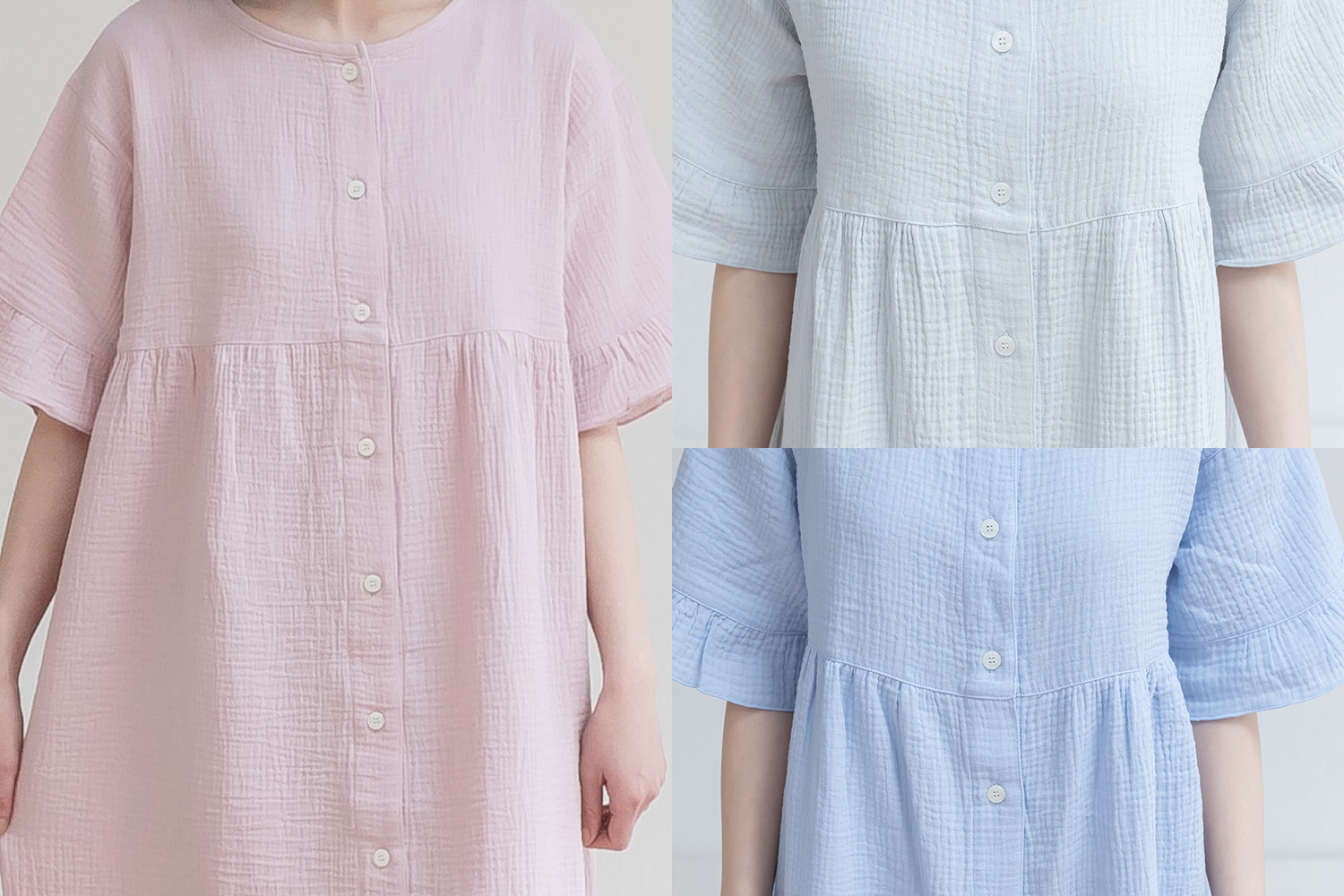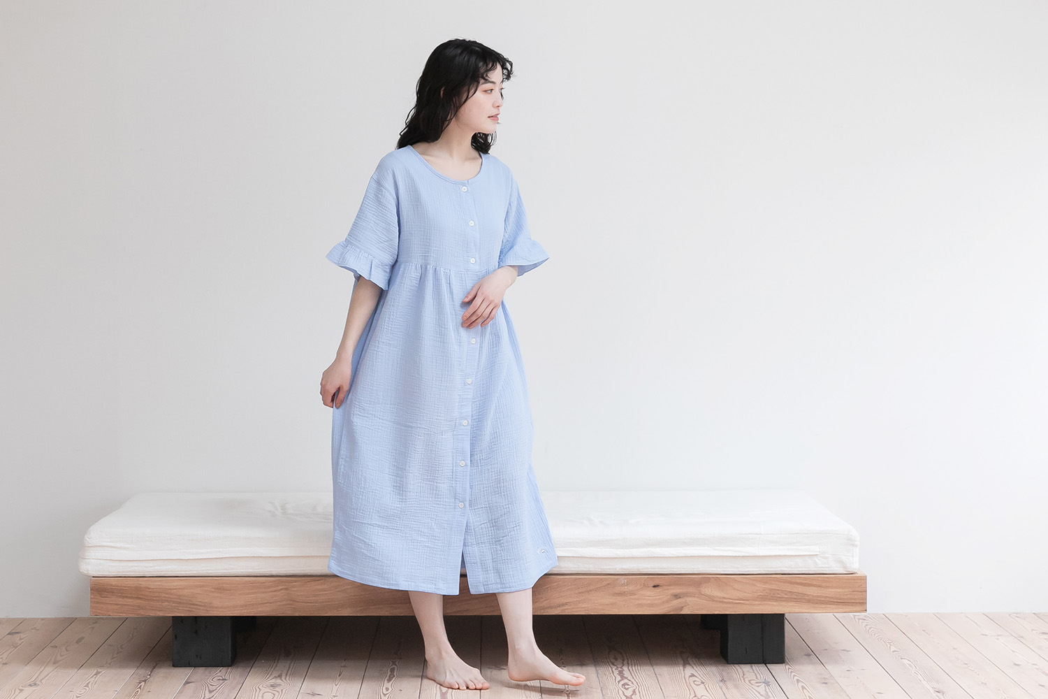4月~8月(春・夏) ふんわりしたダブルガーゼの空気層が程よく体温を保ちます。 人気の通年素材を、夏場でも涼しく着られる「半袖×ワンピース型」にアレンジしました。