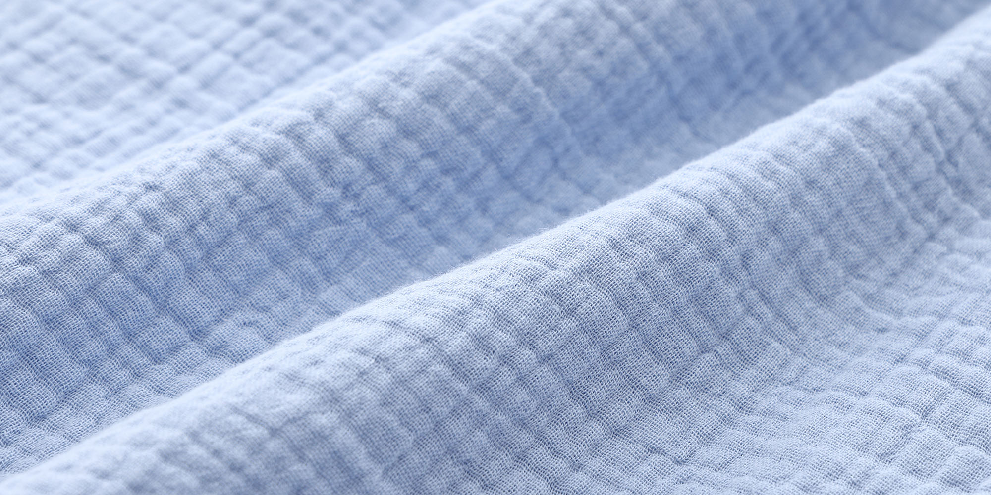 シアバター・オリーブオイル・シルクアミノ酸・スクワランという、4つの天然保湿成分をナノ粒子化して配合し、肌へのやさしさにこだわった加工を施したダブルガーゼ素材です。 繊維1本1本に潤いを感じるような、しっとりした質感が特徴です。 さらに、生地表面には自然な「うね(ウェーブ)」を出す特殊技術を用いることで、従来のガーゼよりもやわらかくふんわりと仕上げています。 2重構造のガーゼは、空気を含みながら通気性も保ち、心地よい保温力を生み出します。デリケートな肌にも安心して使える、優しい生地感です。