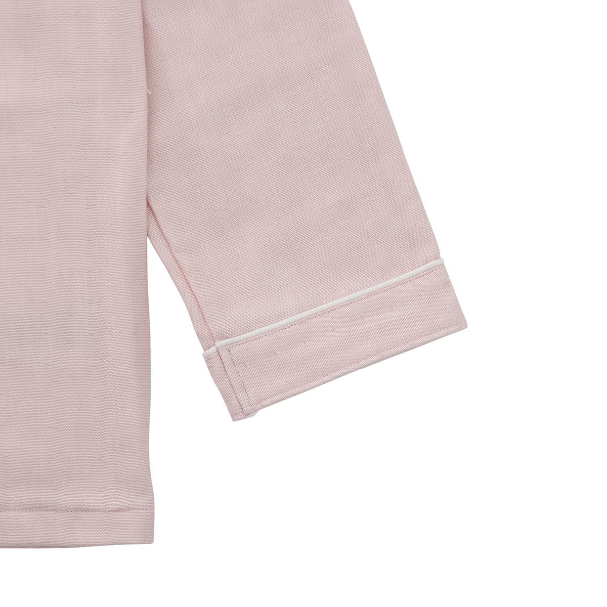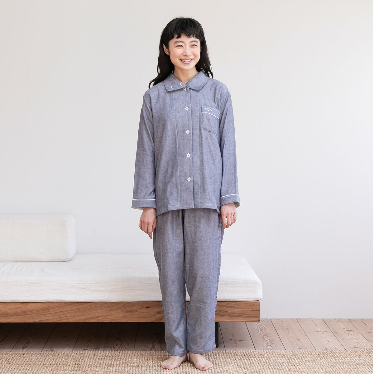 このパジャマには、第一紡績株式会社の無撚糸「UNTWISH®(アンツィッシュ®)」を採用しています。 わたのまま糸にしたような、ふわっとやわらかい糸で、撚りをかけないことでコットン本来のやさしさを最大限に引き出しています。 生地には、特許取得済みの「ストレッチ三重ガーゼ」を使用。 3枚のガーゼを重ねて織り上げ、大きめに織った生地を特殊加工で縮めることにより、引っ張ると元の幅に戻ろうとする力が働く構造を実現しています。 これにより、天然素材でありながら横方向に約10%のストレッチ性を発揮(当社比)、寝返りや体の動きにやさしくフィットします。 ※伸長力約10% 伸び率試験:BOKEN JIS-L-1096 D法実施。 また、3層のガーゼの間に生まれる空気の層が保温性と保湿性を高め、薄く起毛を施した表面がやわらかな暖かさをプラス。 寒い季節にも軽やかで快適な着心地を保ちます。 衿裏には肌にやさしい転写プリントネームを使用し、タグの擦れを軽減。 縫製部分にはやわらかいウーリー糸を使用して肌当たりをやさしく仕上げています。 さらに、ウエストには独自開発の「ソフティーゴム®」を採用し、締めつけ感を抑えながら高い耐久性を両立しています。
