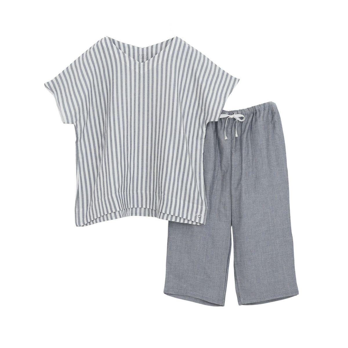雲ごこちガーゼ 丸首全開半袖+7分丈パンツ 軽やかで涼しく、動きやすく、夏の夜に寄り添う一着。 やわらかくしなやかな3重ガーゼ素材を、より涼やかに楽しめる半袖&7分丈パンツデザインに仕立てました。 首まわりはすっきりとした丸首、前開き全開タイプで着脱もスムーズ。ボトムスは足元にほどよい抜け感のある7分丈仕様で、蒸し暑い季節にも快適です。