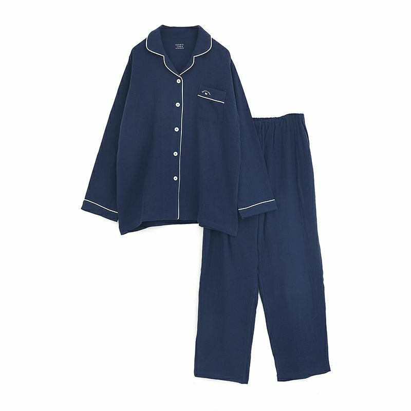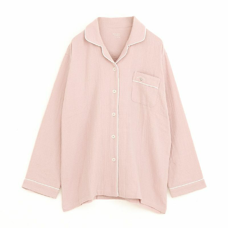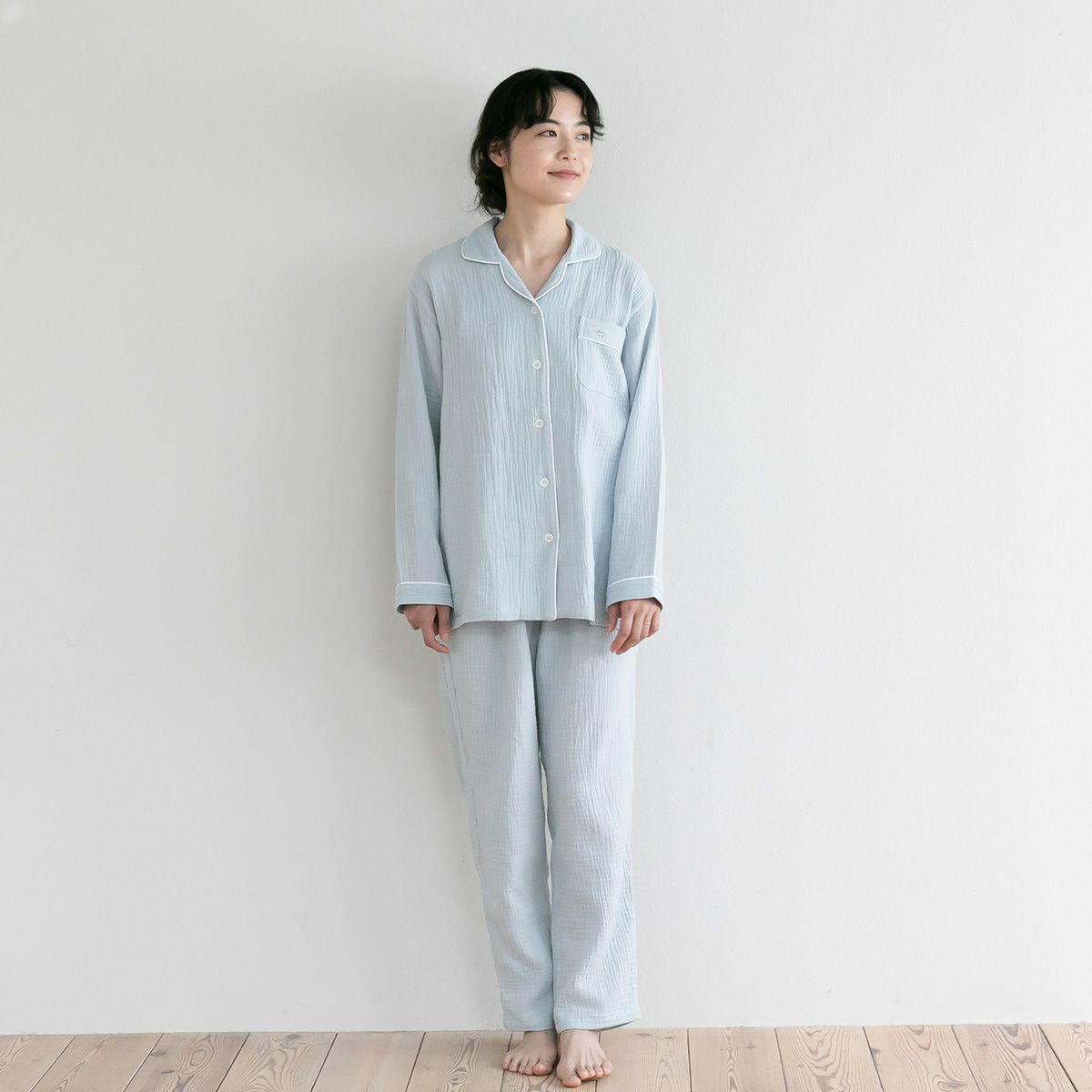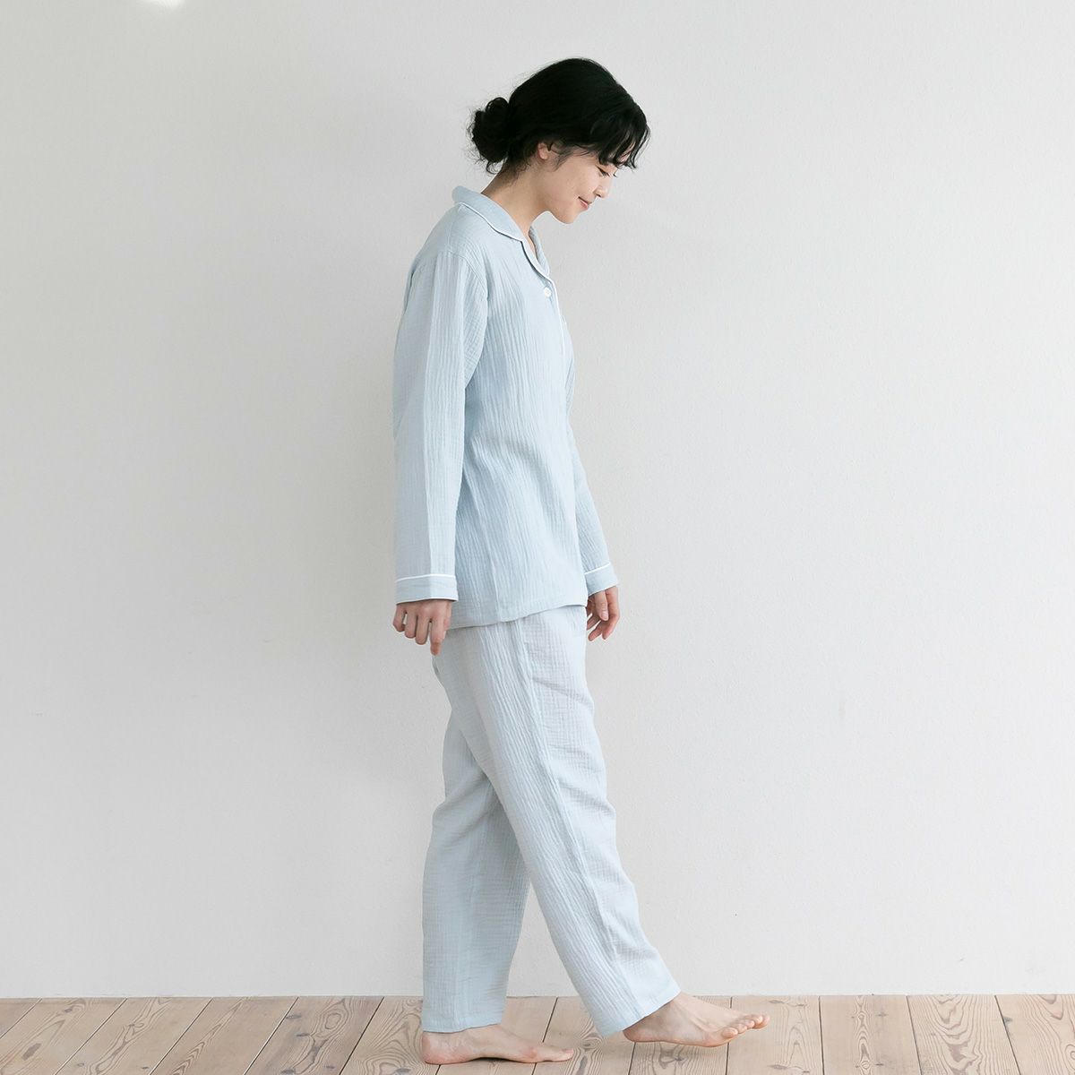 乾燥が気になる季節も、心地よく眠れるナイトウェア。 アフリカ原産の保湿成分「シアバター」をはじめ、オリーブオイル、シルクアミノ酸、スクワランなど、4つの天然由来スキンケア成分を配合した特別な加工を施したガーゼ素材を使用。 まるでスキンケアをまとうような、しっとりとなめらかな肌ざわりが特徴です。 生地には、自然な“ウェーブ”が入った二重ガーゼを採用。 やわらかで空気を含んだふっくら感があり、肌に触れるたびに包み込まれるような安心感。 空気層によるほどよい保温性もあり、春・秋の季節の変わり目にぴったりの一着です。