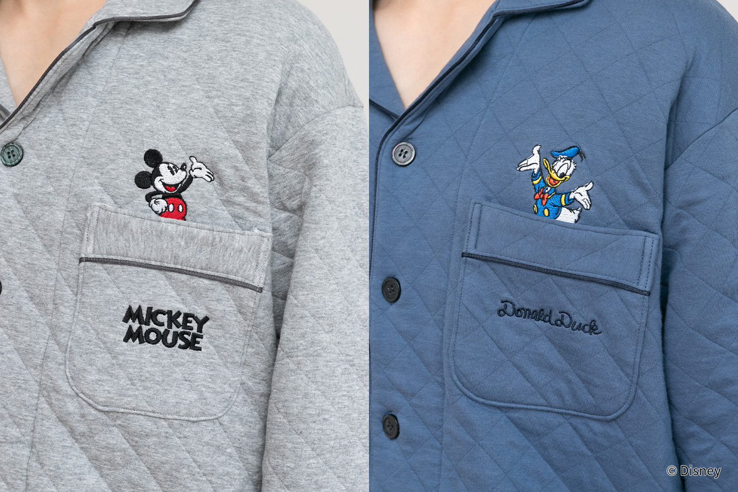 中綿キルトで暖かく、快適に過ごせるパジャマ。ミッキーマウスとドナルドダックの刺繍をアクセントに、首ぐりにはロゴテープをあしらいました。 ポケットから飛び出すように見えるキャラクター刺繍が遊び心をプラス。 さらに袖口カフスには、ミッキーの手やドナルドの帽子の刺繍を施し、ディズニーファン心をくすぐるデザインに仕上げています。