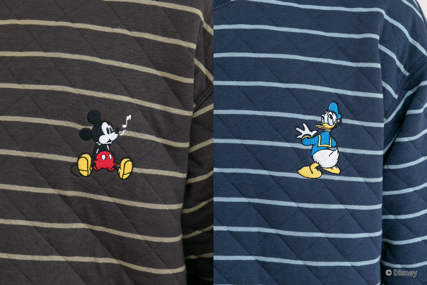 ふっくら中綿キルトで暖かさをキープ。ディズニーキャラクター(ミッキーマウス&ドナルドダック)の刺繍をアクセントに、カジュアルなボーダー柄が映えるデザイン。