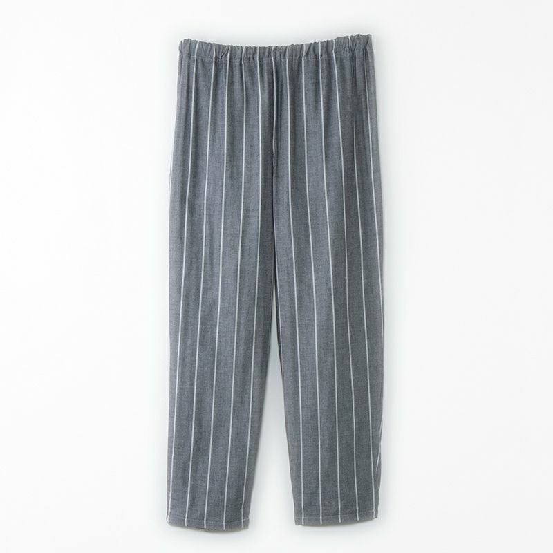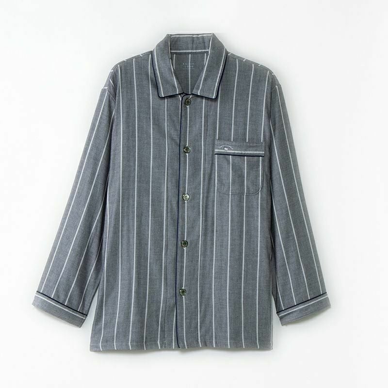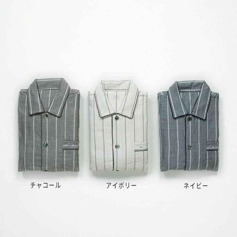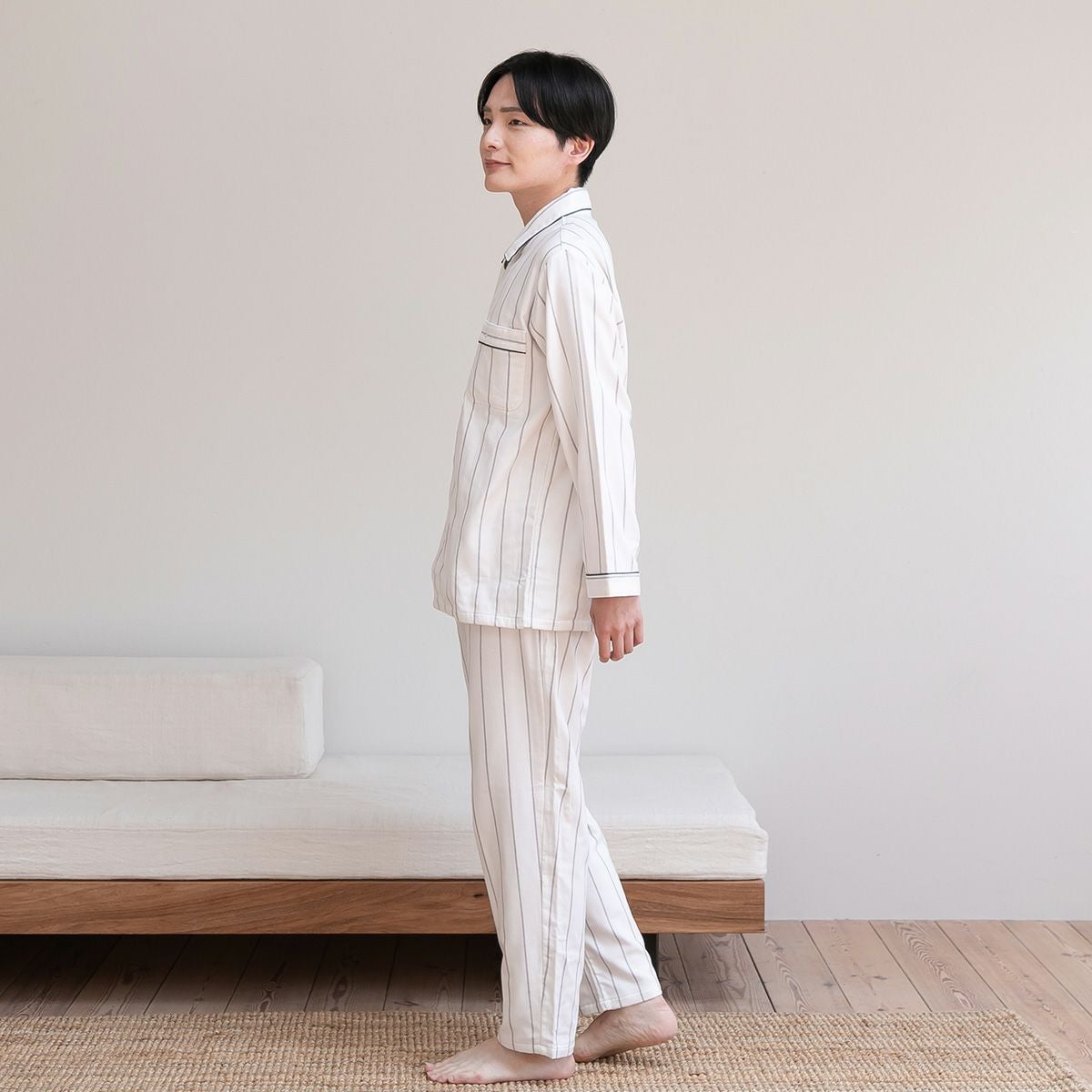 このパジャマには、第一紡績株式会社の無撚糸「UNTWISH®(アンツィッシュ®)」を採用しています。 わたのまま糸にしたような、ふわっとやわらかい糸で、撚りをかけないことでコットン本来のやさしさを最大限に引き出しています。 生地には、特許取得済みの「ストレッチ三重ガーゼ」を使用。 3枚のガーゼを重ねて織り上げ、大きめに織った生地を特殊加工で縮めることにより、引っ張ると元の幅に戻ろうとする力が働く構造を実現しています。 これにより、天然素材でありながら横方向に約10%のストレッチ性を発揮(当社比)、寝返りや体の動きにやさしくフィットします。 ※伸長力約10% 伸び率試験:BOKEN JIS-L-1096 D法実施。 また、3層のガーゼの間に生まれる空気の層が保温性と保湿性を高め、薄く起毛を施した表面がやわらかな暖かさをプラス。 寒い季節にも軽やかで快適な着心地を保ちます。 衿裏には肌にやさしい転写プリントネームを使用し、タグの擦れを軽減。 縫製部分にはやわらかいウーリー糸を使用して肌当たりをやさしく仕上げています。 さらに、ウエストには独自開発の「ソフティーゴム®」を採用し、締めつけ感を抑えながら高い耐久性を両立しています。