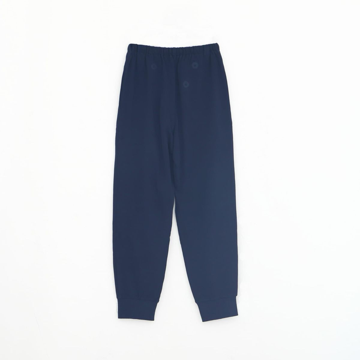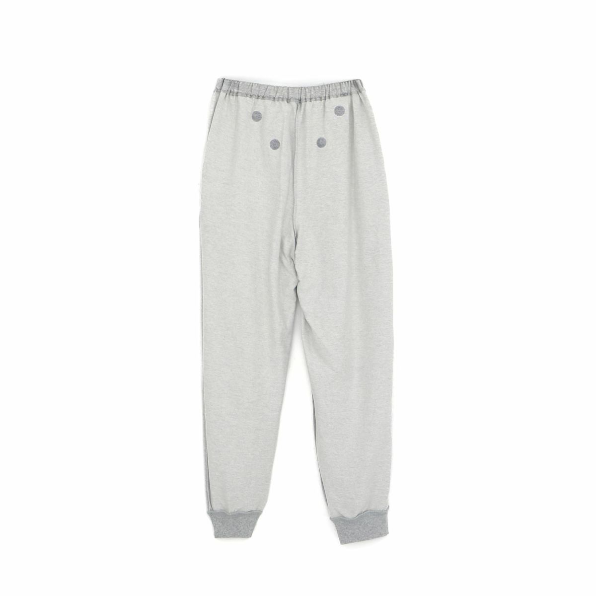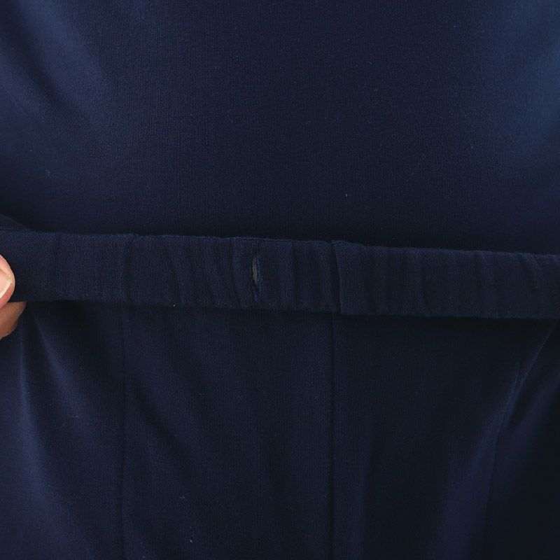 ウエスト総ゴム(ソフティゴム、ゴム取替口有)、前閉じ、両脇ポケット、ウエスト紐、裾口リブ、長パンツ |