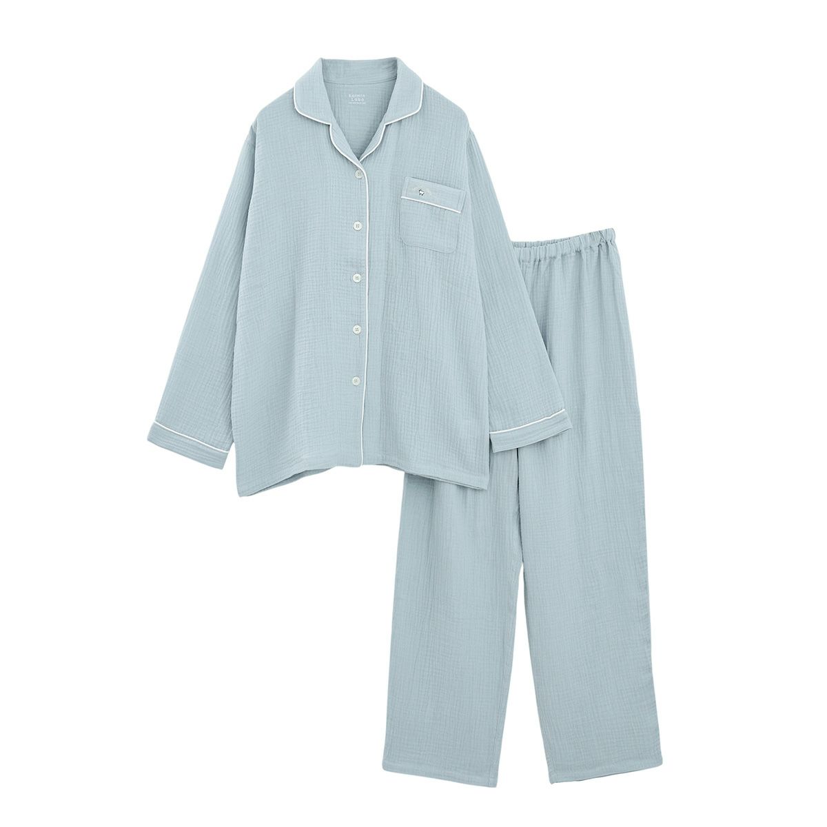 乾燥が気になる季節も、心地よく眠れるナイトウェア。 アフリカ原産の保湿成分「シアバター」をはじめ、オリーブオイル、シルクアミノ酸、スクワランなど、4つの天然由来スキンケア成分を配合した特別な加工を施したガーゼ素材を使用。 まるでスキンケアをまとうような、しっとりとなめらかな肌ざわりが特徴です。 生地には、自然な“ウェーブ”が入った二重ガーゼを採用。 やわらかで空気を含んだふっくら感があり、肌に触れるたびに包み込まれるような安心感。 空気層によるほどよい保温性もあり、春・秋の季節の変わり目にぴったりの一着です。