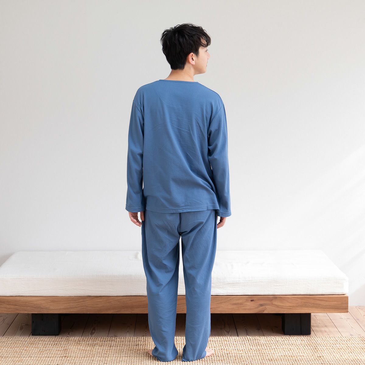 ・初夏(5月~6月) 気温が上がり始めるこの時期には、さらっとした肌ざわりと通気性に優れたニットサッカー素材が活躍。 コアヤーン糸による軽やかな着心地で、暑さを感じる日も快適に。 汗をかいても素早く乾き、肌を清潔に保ちます。 ・盛夏(7月~8月) 暑さのピークにも対応する通気性と吸汗速乾性。 エアコンの冷えが気になる夜も、長袖仕様でやさしく体をカバーし、ムレにくく快適な眠りをサポートします。 ・晩夏(8月~9月) 日中は暑く、夜は涼しさが増す晩夏には、温度変化に対応しやすいこのパジャマがぴったり。 肌ざわりのよさと適度な保温性が、心地よい睡眠環境を整えます。