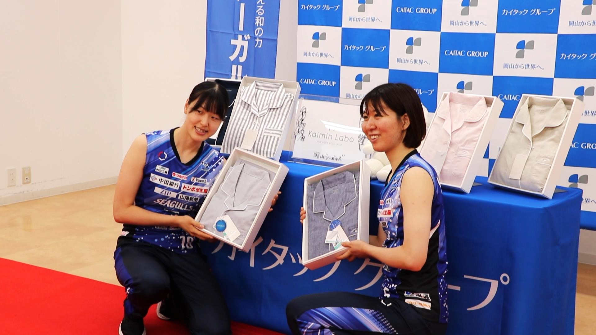 この度、岡山に本社を置く(株)カイタックファミリーが、 同じく岡山を拠点に活動する岡山シーガルズの選手・スタッフへ、『良い睡眠をとって最高のパフォーマンスを発揮して欲しい』との想いから、『快眠ラボ』ブランドの高品質な国産パジャマを贈呈させていただきました。